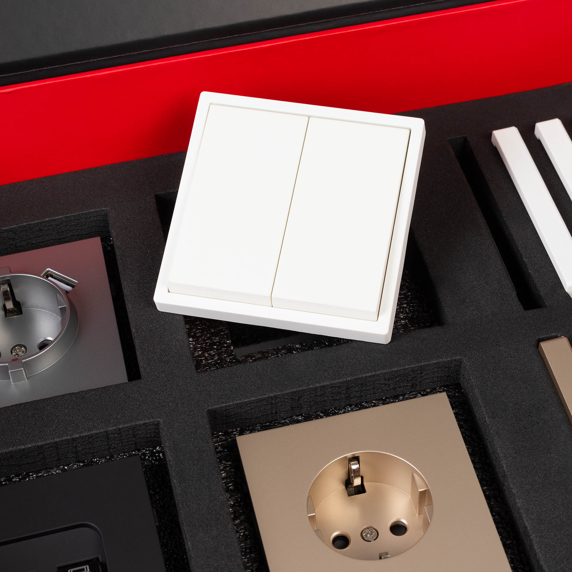 Демо-кейс с наполнением электроустановочных изделий серии TENDO. Демо-кейс содержит: Рамки серии TENDO в цветах белый, черный, золотой и серебристый (серый). Поверхность рамок имеет матовое и Soft-Touch покрытие; Механизм компьютерной розетки (двойной) в черном цвете - арт.054595 Механизм розетки с дополнительными USB Type A + Type A выходами в серебристом(сером) цвете - арт.054084 Механизм выключателя на две клавиши (проходной) в белом цвете - арт.054556. Механизм розетки под евровилку в золотом цвете - арт. 054081 Рамки представленной серии накладного типа монтажа - не требуют дополнительного оборудования для установки рамки на механизме.