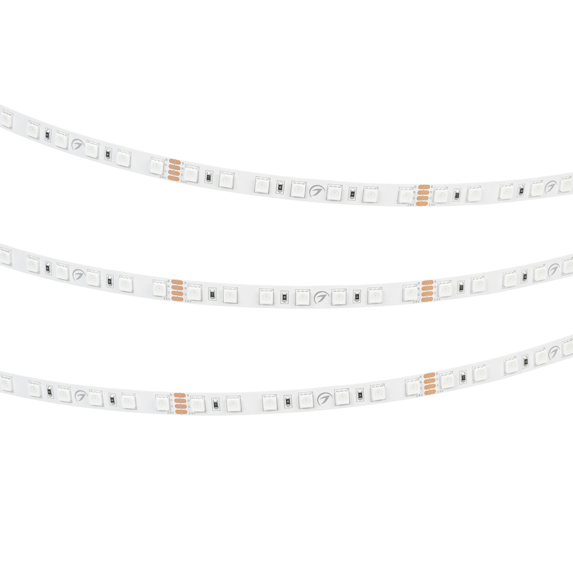 Мультицветная светодиодная лента RT серии B70. Светодиоды SMD 5060, 70 шт/м, белая плата шириной 10 мм, скотч 3M. Цвет RGB, угол 120°. Питание 24 В, мощность 14 Вт/м (70 Вт на 5 м). Размеры 5000x10x2 мм. Мин. отрезок 100 мм, 7 светодиодов. Цена за 1 м.